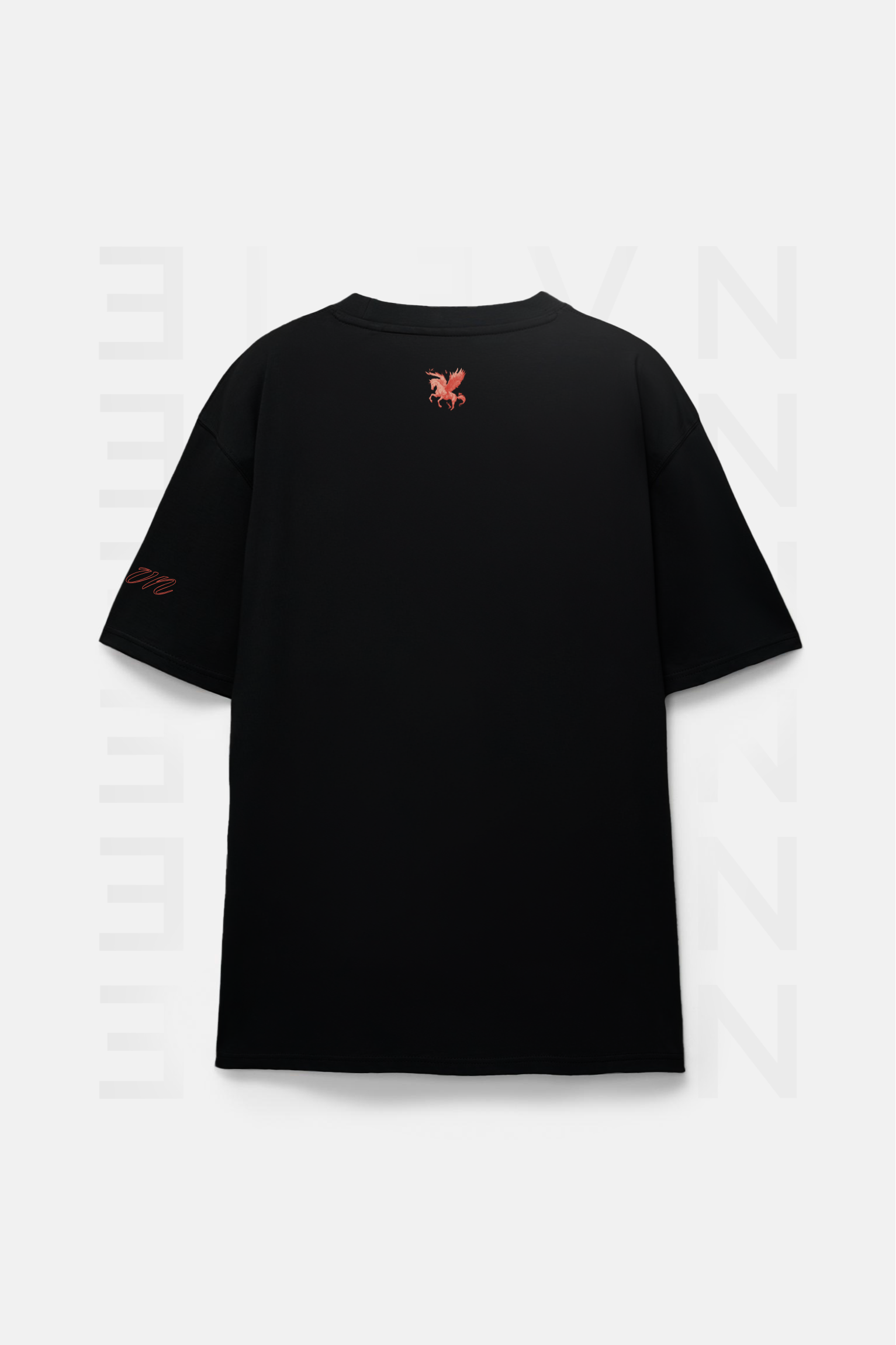 ➔ Estampado frontal con pegaso en rojo intenso y tipografía cursiva que evoca grandeza