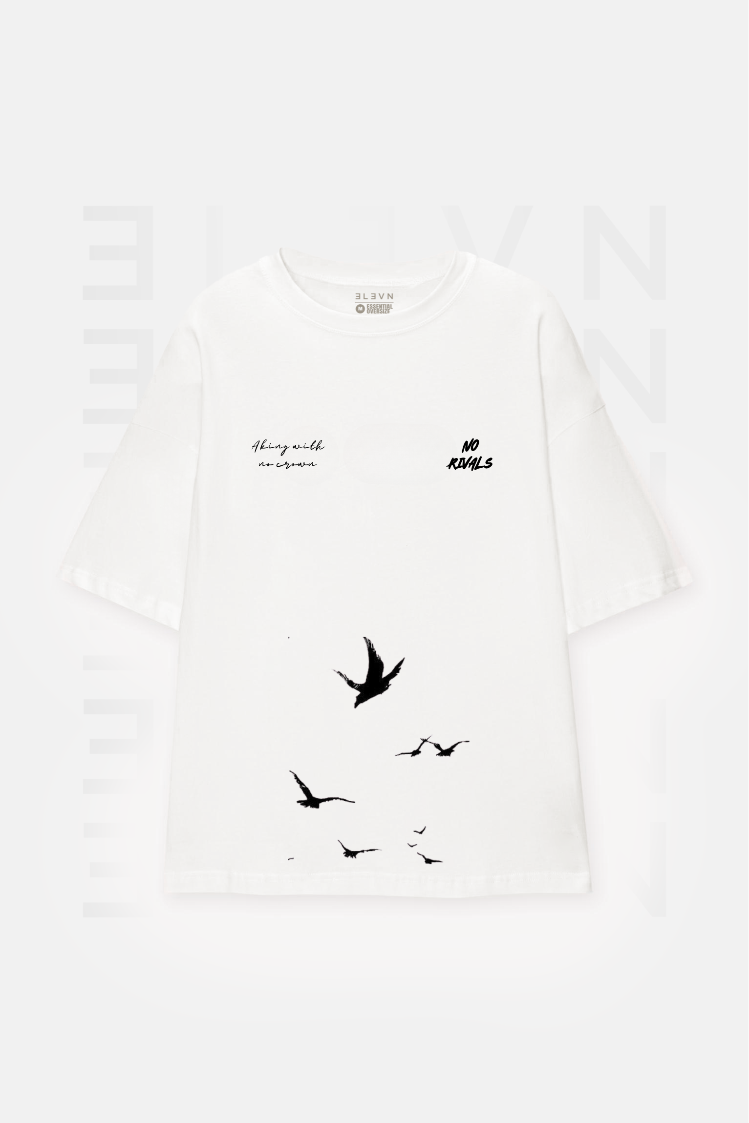 ➔ Estampado frontal con aves en vuelo y tipografía No Rivals, mensaje que evoca independencia y grandeza