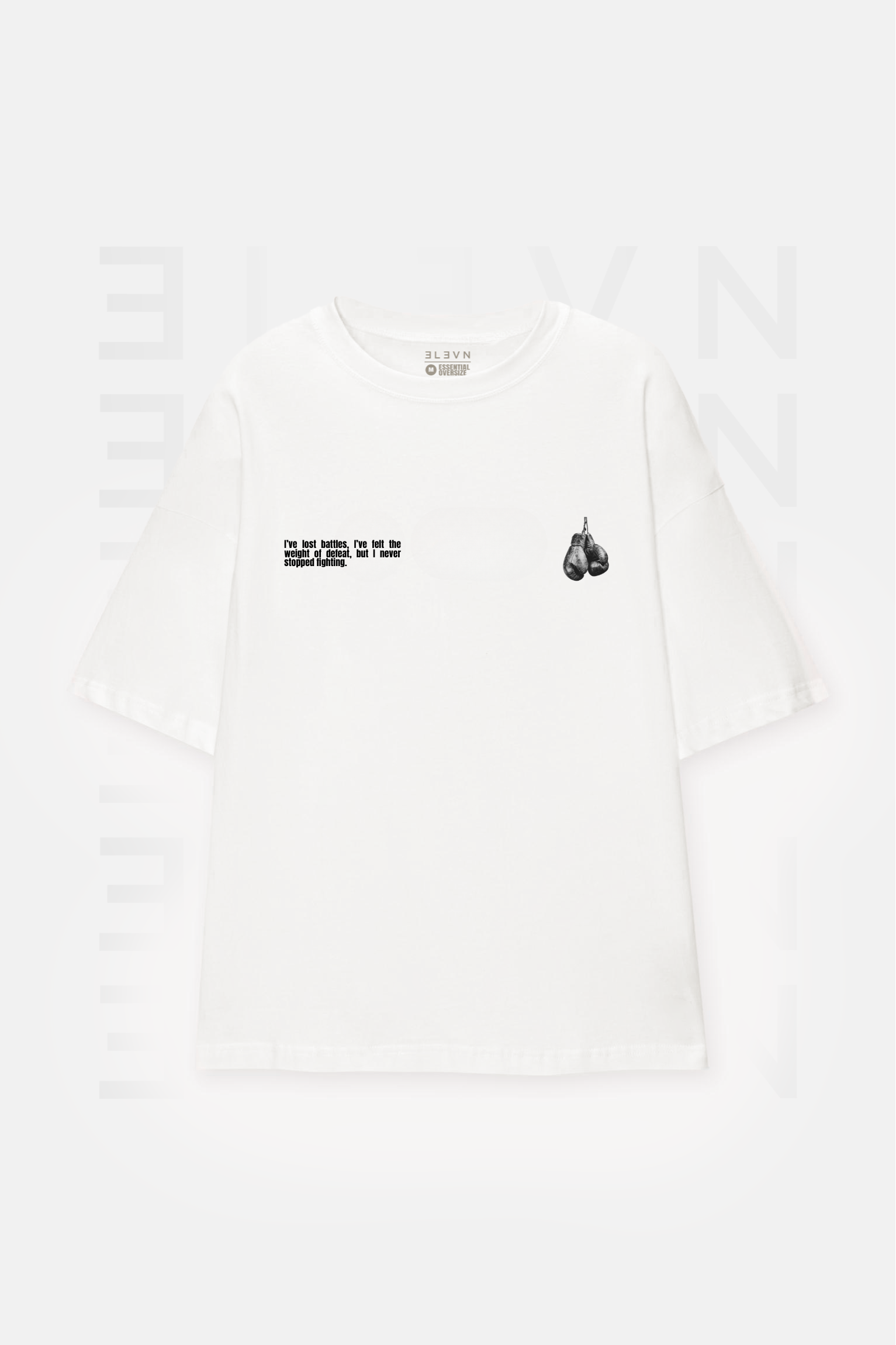 ➔ Estampado frontal minimalista con guantes de boxeo y mensaje inspirador